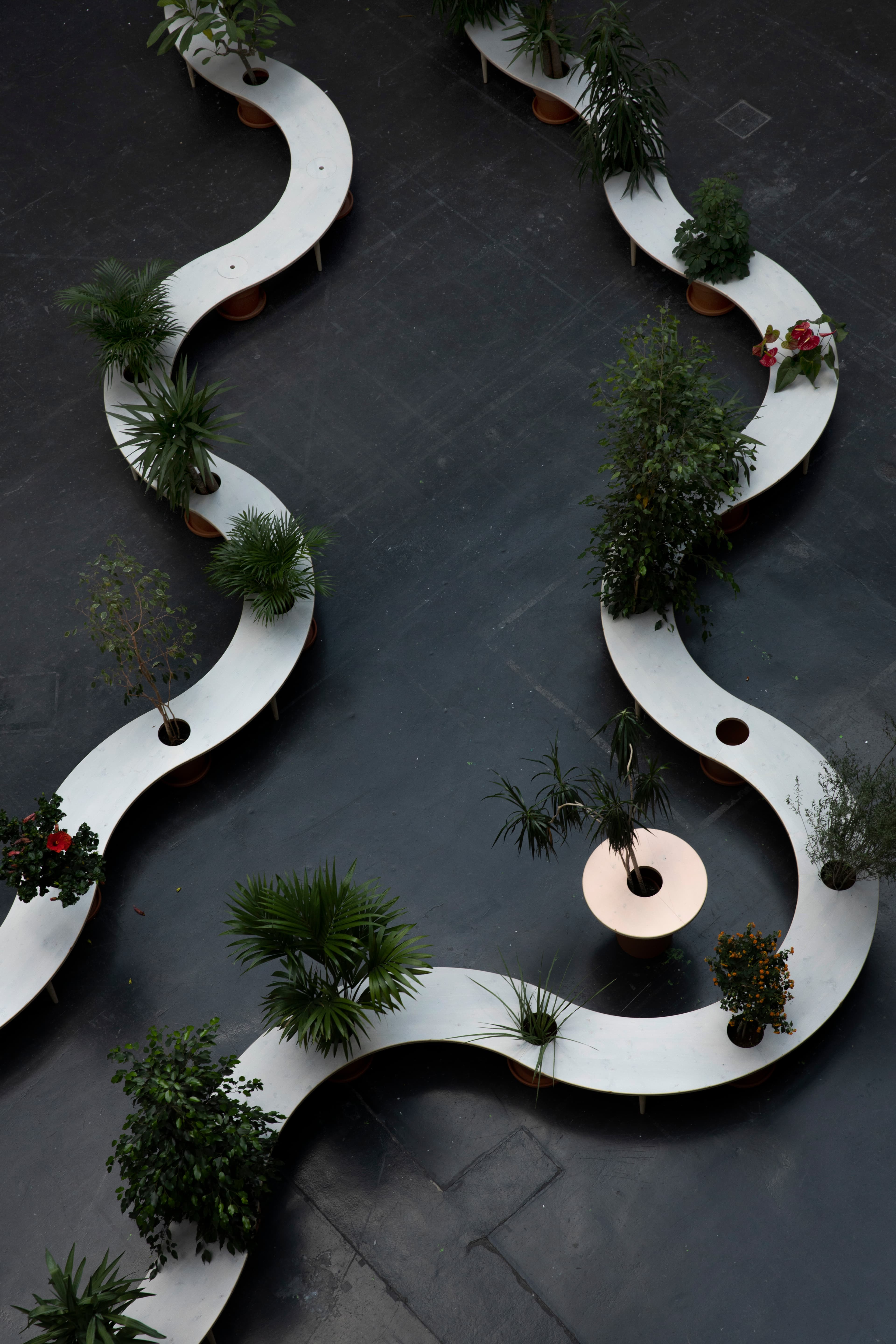 The bench consists of modules that cover 1/6 of a circle each. The ends are pushed together and lock securely on to the plant pot. This allows for a versatile application and free arrangement of plants.